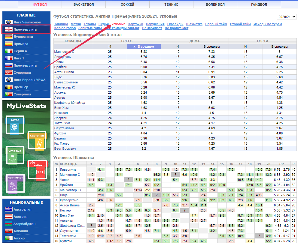 Сайт 24score хранит данные всех ведущих футбольных чемпионатов по угловым ударам за последние годы, а также множество другой футбольной статистики. Во вкладке лиг показано, сколько в среднем каждая команда делает подач с угла поля и как часто позволяет это делать сопернику.