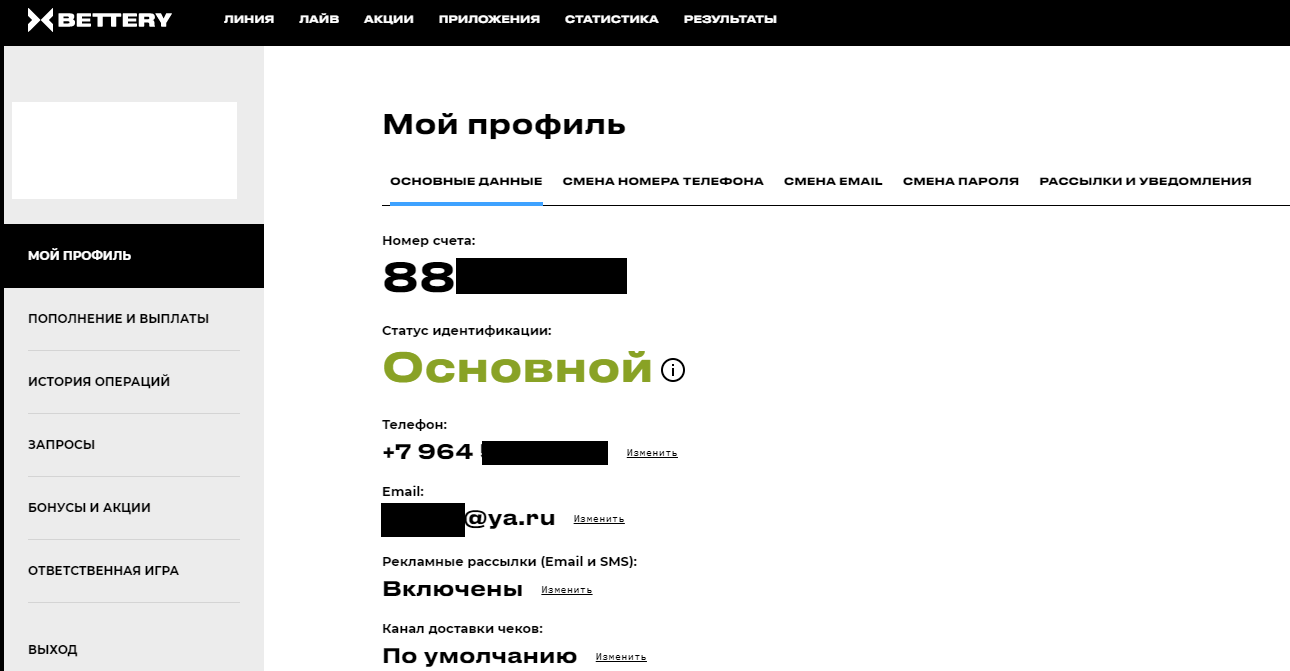 Мой профиль. Игрок может изменить некоторые данные, указанные при регистрации: номер телефона, e-mail, настройки рассылки и уведомлений, а также пароль для входа в аккаунт.
