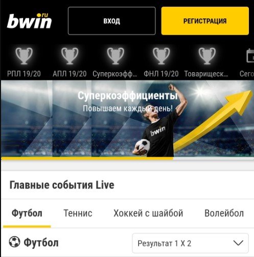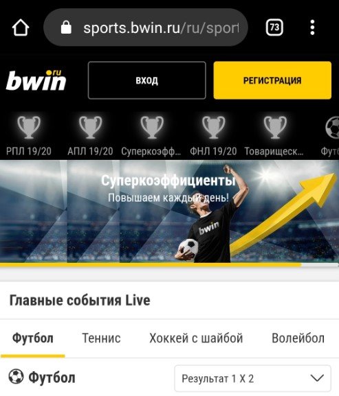 Официальный сайт БК Bwin также доступен из браузера мобильного телефона. При заходе на bwin.ru со смартфона страница автоматически подстроится под параметры экрана. Войти в личный кабинет можно с помощью кнопки «Вход» в шапке страницы.