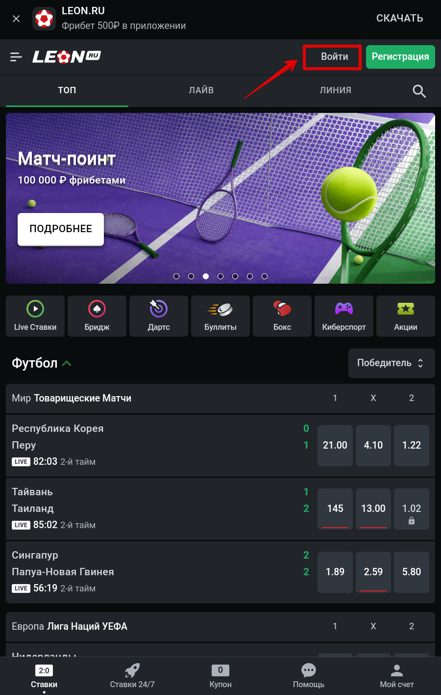 Вход через мобильный также доступен из официального приложения БК Leon для устройств, работающих на платформах iOS и Android. Программу можно скачать на сайте букмекера при заходе с телефона или через компьютер. Чтобы попасть в личный кабинет, нужно нажать на кнопку «Войти» в правом верхнем углу экрана.