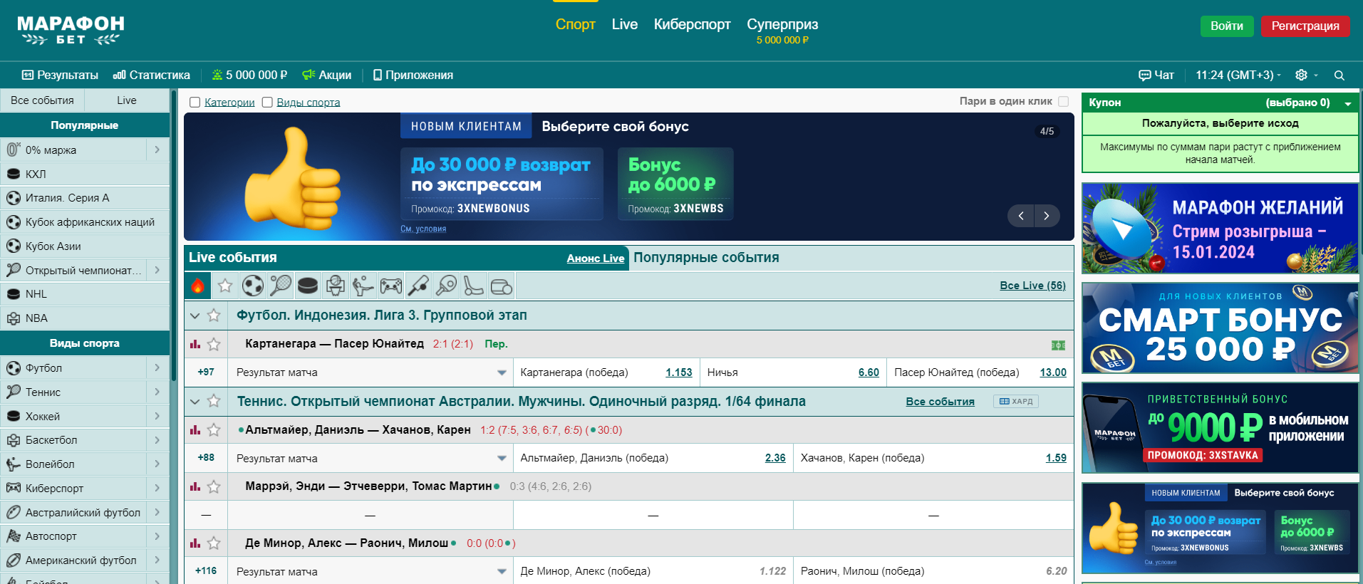 После авторизации на сайте букмекерской компании «Марафон» пользователь может заключать пари в прематче и в режиме live, вносить средства на счет, снимать выигрыши, а также участвовать в бонусных программах и акциях БК.