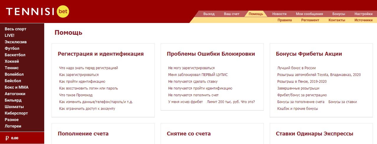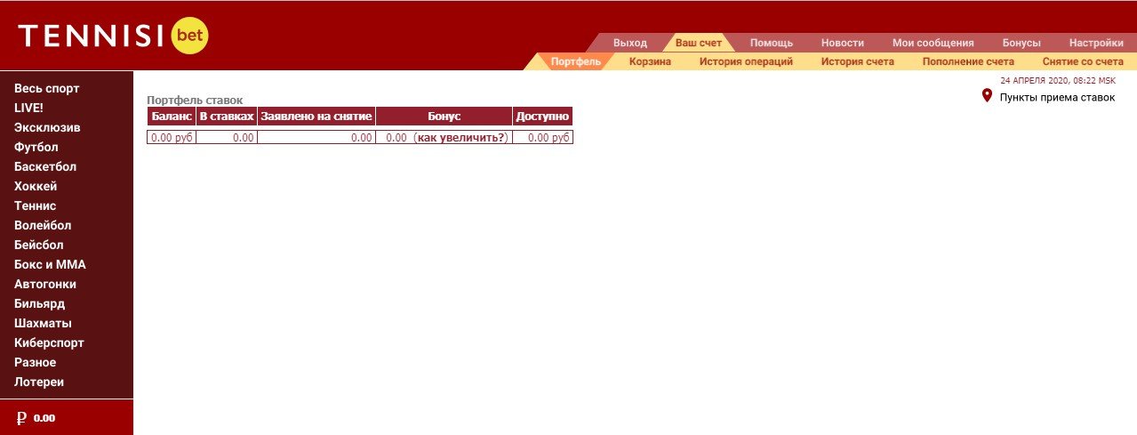 Личный кабинет на сайте БК «Тенниси» – удобный и функциональный инструмент для управления ставками и игровым счетом. Здесь довольно подробно расписаны все опции и возможности, доступные зарегистрированному пользователю.