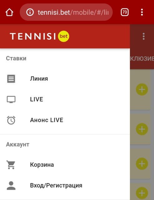 Управление личным кабинетом возможно и в мобильной версии сайта – tennis.bet/mobile. Чтобы попасть в аккаунт, зайдите в меню (иконка в левом верхнем углу экрана). В выпавшем списке появится пункт «Вход/Регистрация».