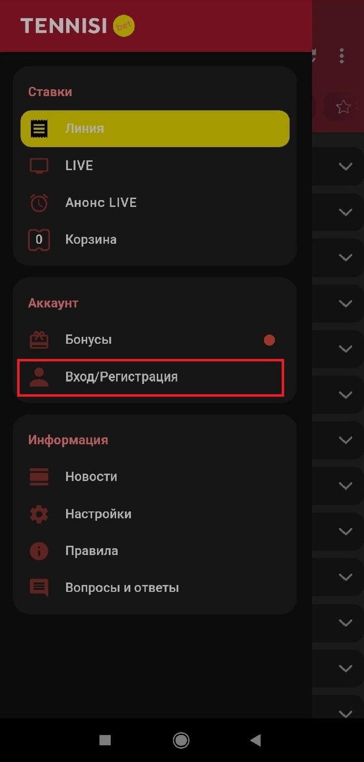 Управление личным кабинетом возможно и в мобильной версии сайта – tennis.bet/mobile. Чтобы попасть в аккаунт, зайдите в меню (иконка в левом верхнем углу экрана). В выпавшем списке появится пункт «Вход/Регистрация».