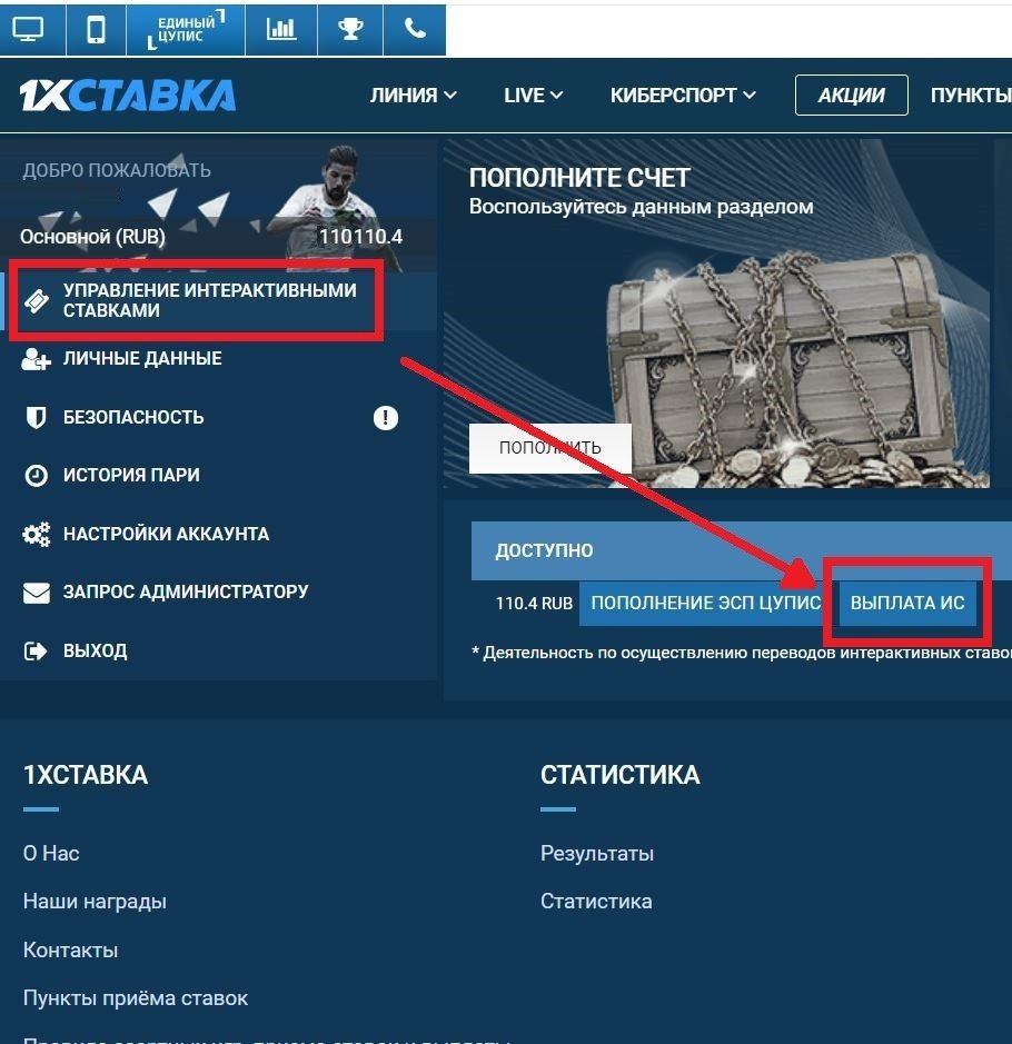 После авторизации на сайте БК требовалось перейти в личный кабинет, нажать на вкладку «Управление ставками». В разделе «Управление интерактивными ставками» следовало выбрать пункт «Выплата ИС».