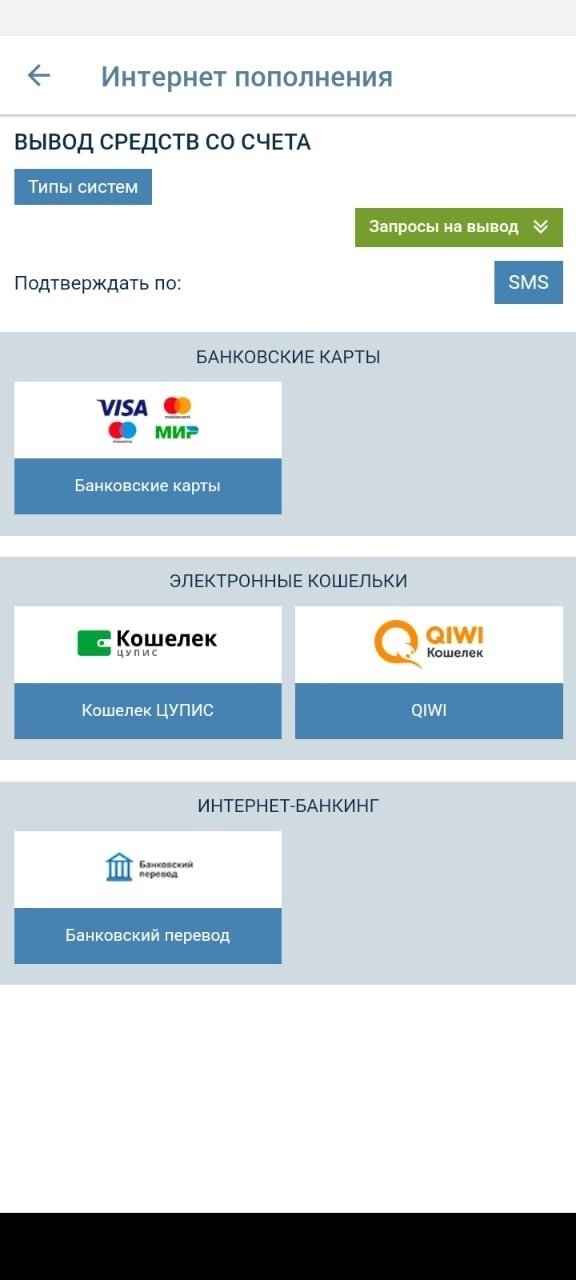 На экране появлялись варианты вывода денег: банковские карты, Кошелёк ЦУПИС, «ЮМани», банковский перевод.