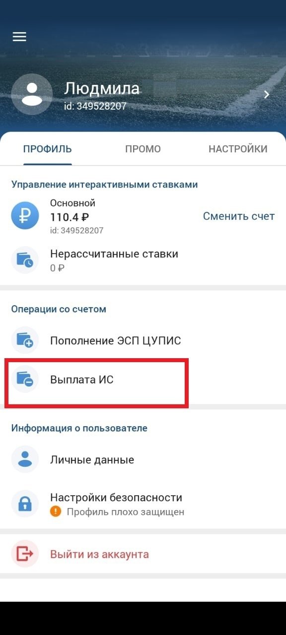 После авторизации на сайте БК требовалось перейти в личный кабинет, нажать на вкладку «Управление ставками». В разделе «Управление интерактивными ставками» следовало выбрать пункт «Выплата ИС».