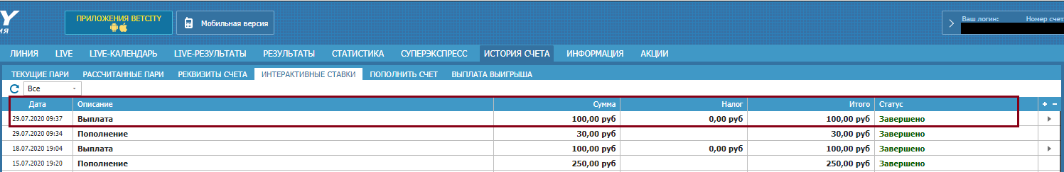 Отследить статус заявки на выплату выигрыша можно во вкладке «История счета», раздел «Интерактивные ставки».