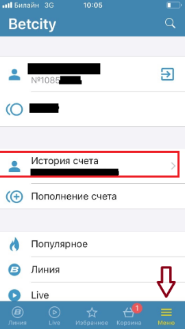 В приложениях БК БЕТСИТИ для смартфонов на базе iOS и Андроид для получения выигрыша нужно зайти в меню программ, вкладка «История счета». Нажмите на пункт «Выплата выигрыша».