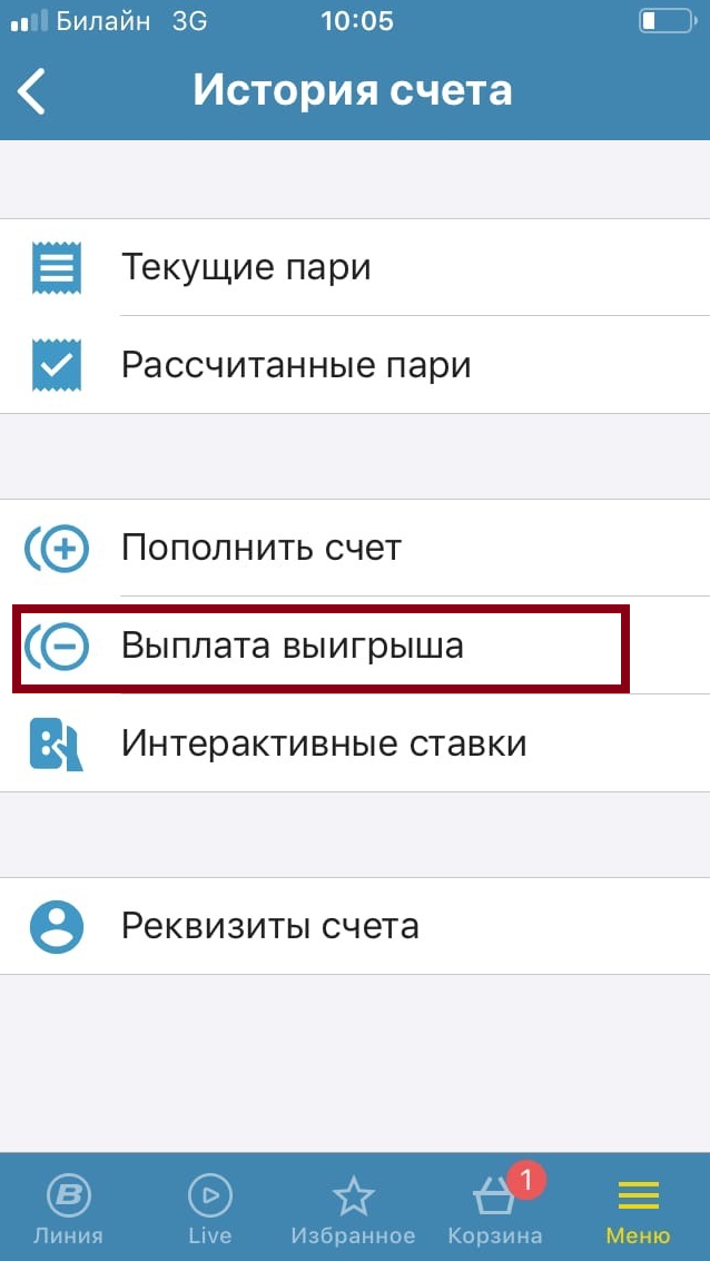 - После авторизации нажмите на вкладку «История счета», пункт «Выплата выигрыша».