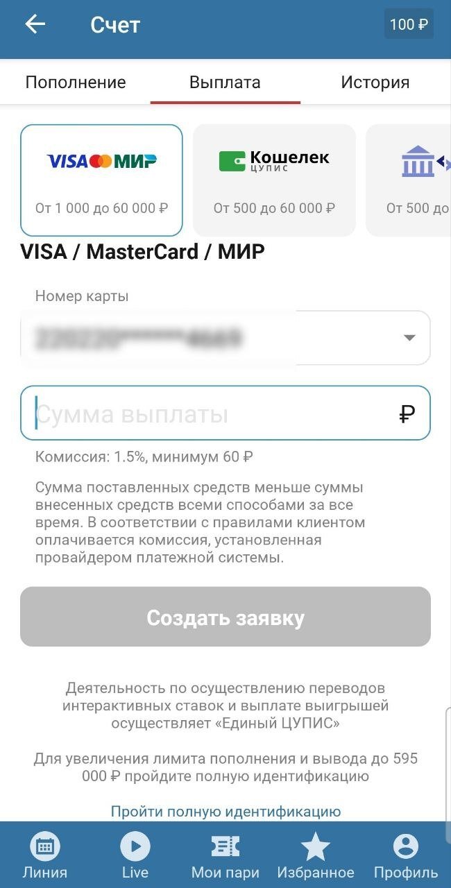 - В пункте «Выплата выигрыша» укажите желаемый способ вывода (банковские карты, кошелек ЦУПИС, ЮMoney или банковский перевод), а также впишите сумму, которую хотите снять со счета. Нажмите на пункт «Создать заявку».