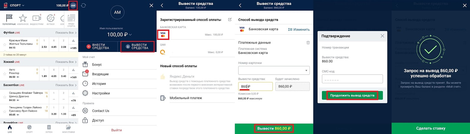 Вывести деньги со счета БК «Марафон» можно следующими способами:
