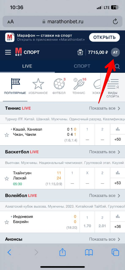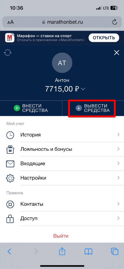 Авторизуйтесь на сайте БК «Марафон» и зайдите в меню «Мой счет».