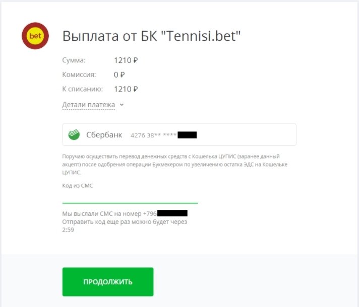 В приложениях Tennisi для смартфонов на базе iOS и Андроид для получения выигрыша нужно зайти в профиль игрока, вкладка «Касса». На открывшейся странице укажите желаемый способ вывода (банковские карты, кошелек ЦУПИС, ЮMoney или банковский перевод), впишите сумму, которую хотите снять со счета, и нажмите «Перейти к оплате». Дальше все аналогично заказу выигрыша на сайте.