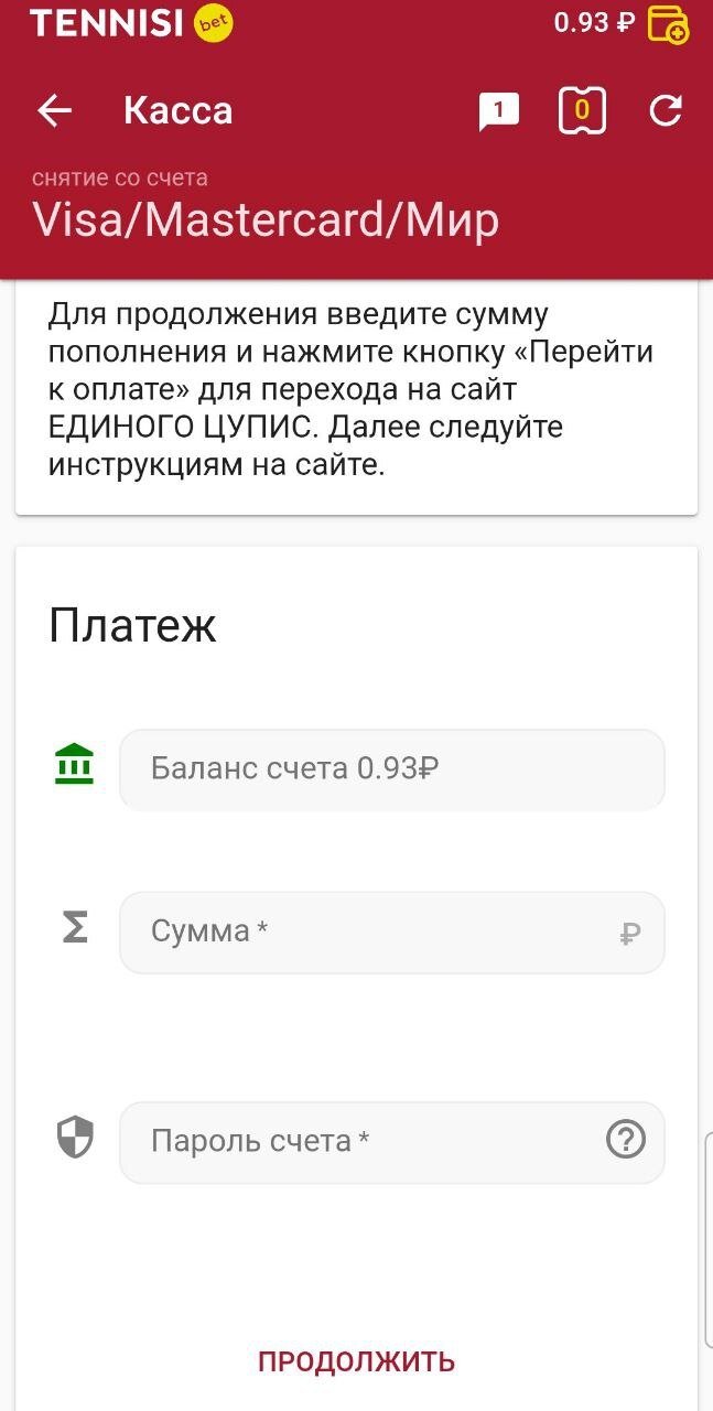 В приложениях Tennisi для смартфонов на базе iOS и Андроид для получения выигрыша нужно зайти в профиль игрока, вкладка «Касса». На открывшейся странице укажите желаемый способ вывода (банковские карты, кошелек ЦУПИС, ЮMoney или банковский перевод), впишите сумму, которую хотите снять со счета, и нажмите «Перейти к оплате». Дальше все аналогично заказу выигрыша на сайте.