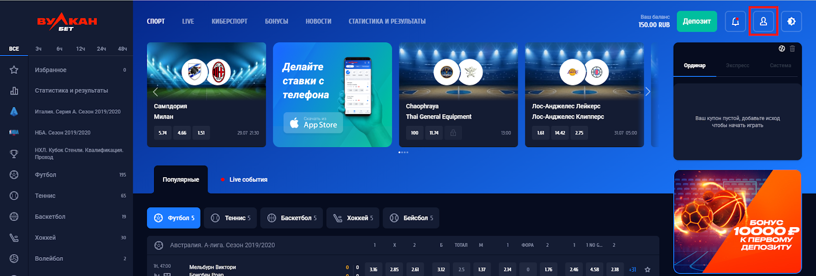 Авторизуйтесь на сайте БК «Вулканбет», зайдите в личный кабинет.