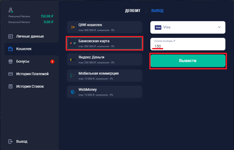 Далее выберите способ вывода средств (в нашем случае — банковскую карту), впишите сумму вывода и нажмите кнопку «Вывести».