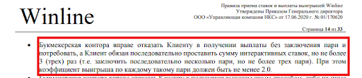 Букмекерская компания Winline работает легально, входит в топ букмекерских контор России и гарантирует быстрые выплаты при соблюдении клиентом установленных правил. Но БК может отказать в выводе средств, если деньги на счёте используются не для заключения интерактивных ставок, а для переводов различного характера (включая перевод из одного населённого пункта в другой, сбор средств, материальную помощь, оплату труда и прочее).