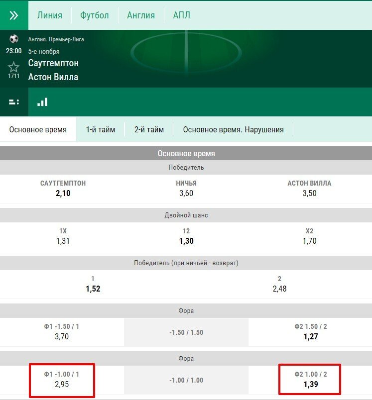 1. Первая команда («Саутгемптон») выигрывает с разницей в два гола и больше. Пари Ф1(−1) выигрывает. Игрок получает на свой счёт сумму поставленных средств, умноженную на коэффициент Ф1(−1) 2.95. То есть 295 рублей на каждые 100 рублей ставки.