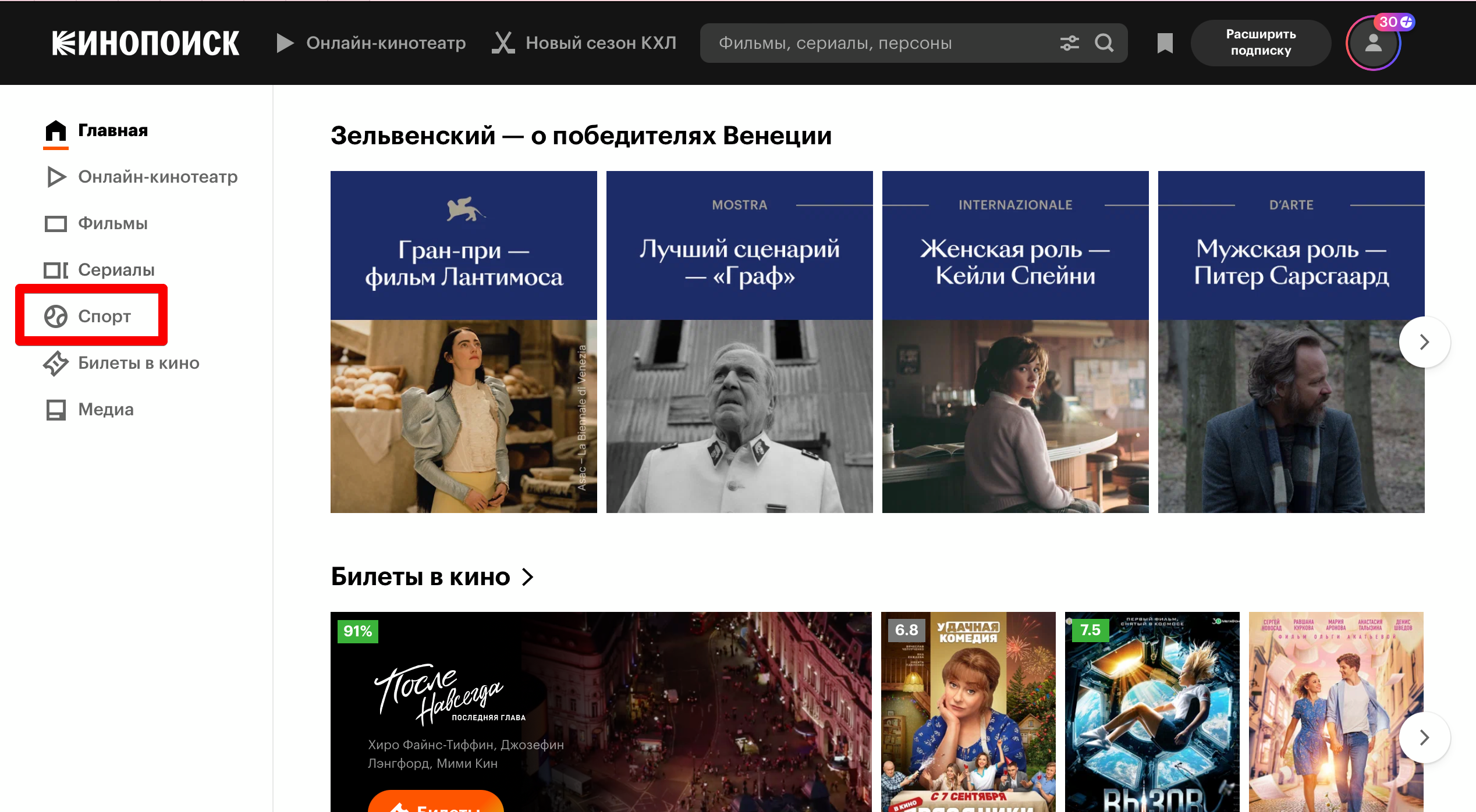 Официальный сайт «Кинопоиска» — kinopoisk.ru. Раздел «Спорт» находится в боковом меню на главной странице ресурса. А весь спортивный контент можно отфильтровать по разделам. Платный контент отмечен логотипом «Плюс». На сервисе представлено свыше 150 каналов, среди которых есть и спортивные, и большинство доступно бесплатно и без регистрации. Чтобы получить к нему доступ, необходимо зарегистрироваться и оформить подписку.