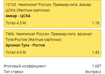 6.05 14:00 Чемпионат России. Премьер-лига. Амкар - ЦСКА. Желтые карточки. Тотал меньше 4.5 (кэф 1.3)