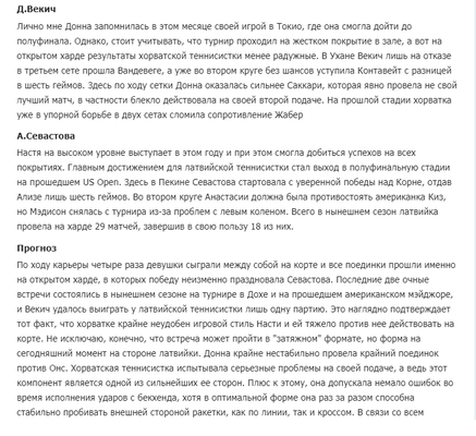 Латвийка использует неудобные вращения при проведении своих ударов, и при этом практически не допускает не вынужденных ошибок. Для победы сегодня Векич надо показать что-то выдающееся, но не думаю что она на это способна и прогнозирую очередную победу Севастовой.