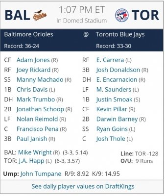 Стартовый питчер "Торонто" - Джеймс Энтони Хэпп (33 года): ERA=3.57, WHIP=1.19, BABIP=.258. Стартовый питчер "Балтимора" - Майк Райт (26 лет): ERA=5.24, WHIP=1.42, BABIP=.305.
