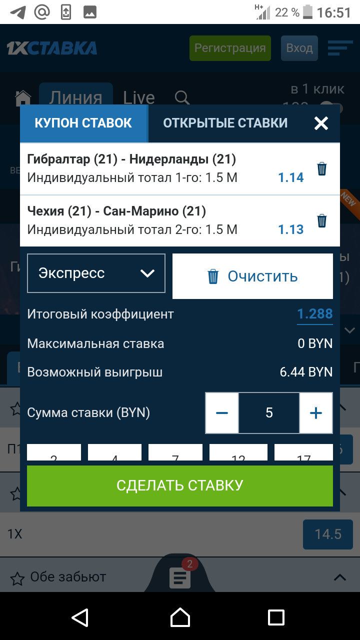 Сборные Сан-Марино и Гибралтара в этом отборочном цикле ещё не забивали. Если подробнее посмотреть обзоры проведённых матчей, то мы увидим, что команды не то что гола забить не могли, но даже проводили поединки без ударов в сторону ворот. По моему мнению, завтра им тоже ничего не светит в плане забитых мячей, уж больно сильные соперники. Сразу хочу обратить внимание, что букмекер «1ХСтавка» предлагает ещё индивидуальные тоталы на Сан-Марино и Гибралтар меньше 1,5: коэффициент на оба события по 1,15, но если перемножить в экспресс, то получится рабочий и сверхнадёжный коэффициент 1,32! Даже можно найти индивидуальный тотал меньше 2 за 1,07 на обе команды. Как могут эти сборные забить по три гола, я не представляю. Так что, обратите внимание, можно сыграть большой суммой надёжно. На сегодняшней день если за весь отборочный цикл сборные Сан-Марино и Гибралтара забьют хотя бы по одному голу, для них это будет достижение!