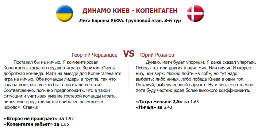 На ничью никто ничего ставить бы не стал, особенно я. Всё потому, что я видел недавний матч «Копенгагена» с ФК «Рига». «Рига» не блистала, но «Копенгаген» — это, конечно, полный трэш: еле-еле добрались до группового этапа. Матч на выезде для «Копенгагена» — это в первую очередь возможность побывать на стадионе, где проходил финал Евро-2012. «Копенгаген» каким-то чудом набрал уже 4 очка и вместе с киевлянами лидирует в группе. Так что задача выиграть или забить точно не стоит. Соответственно, тут и к гадалке ходить не надо, в такой ситуации — учитывая все туристические цели гостевой команды — победа киевлян мне представляется верняком.