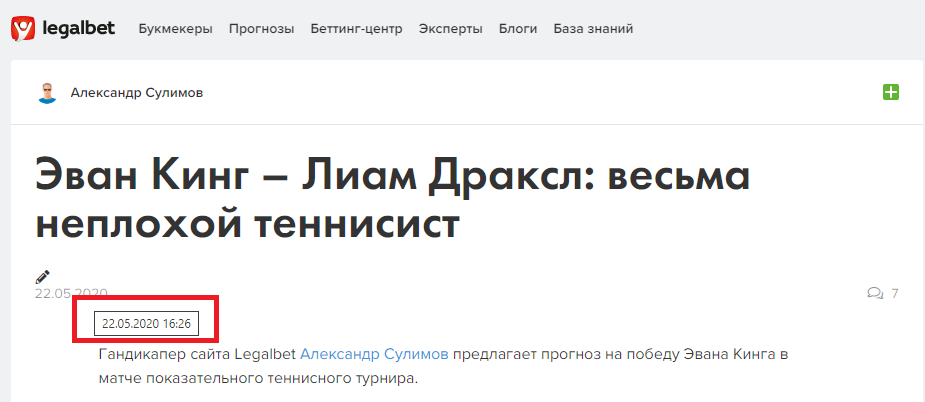 Гандикапер сайта Legalbet Александр Сулимов предлагает прогноз на победу Эвана Кинга в матче показательного теннисного турнира.