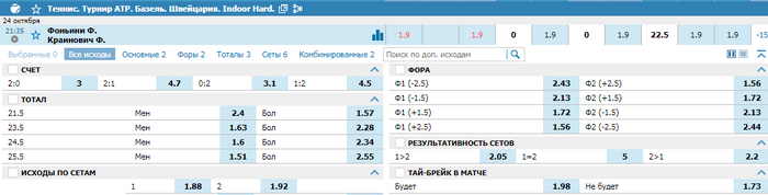 Филипп и Фабио — это два теннисиста, которые очень хорошо принимают и не очень сильно подают. Нас ожидает матч, судьба которого решится в перестрелках на задней линии. Крайинович на прошлой неделе в Стокгольме дошёл до финала и не сыграл ни одного тай-брейка. Фабио в том же Стокгольме уступил Типсаревичу, героически «отжав» два гейма за целый матч. В Базеле стартовал с победы в двух сетах над Попыриным и во втором сете немало чудил на собственной подаче. Поэтому я в этом матче выбираю ставку против тай-брейка и рассчитываю, что через брейки, обоюдные или нет, игроки пройдут мимо 13-го гейма в сетах.