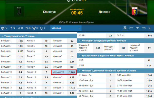 * Ставка на «Трехпутевой тотал меньше 10» эквивалентна ставке на «Тотал меньше 9,5», то есть, ставка пройдет, если в матче будет подано меньше 9,5 угловых.
