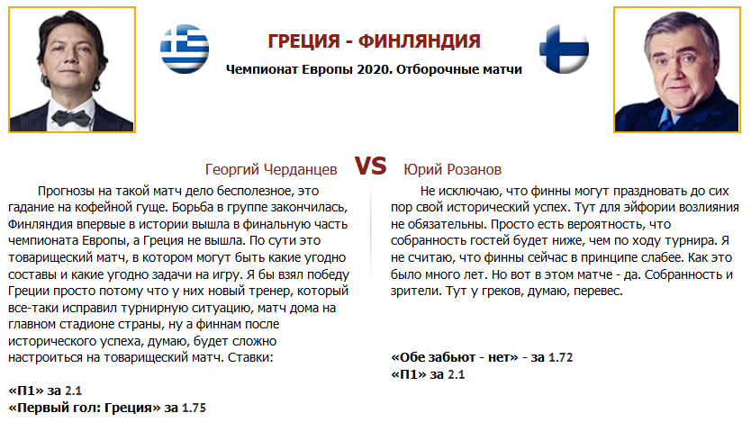 Именно на такие матчи я больше всего люблю делать прогнозы, потому что даже гадание здесь не поможет. Финляндия героически обыграла Лихтенштейн и обеспечила себе попадание на Евро. А у греков нет шансов туда выйти, поэтому ожидаю борьбу. Формулировку товарищеский матч я считаю не совсем верной, ведь матч важен для обеих команд. А значит, понятно, какие будут составы и задачи на игру. На греков я не рискну ставить, даже если бы их тренировал тренерский дуэт Черчесов – Гвардиола, так как даже они не в силах исправить положение, в котором сейчас находится Греция. Финны после своего исторического успеха сыграют без нервов, а обыграть греков можно даже без особого настроя.