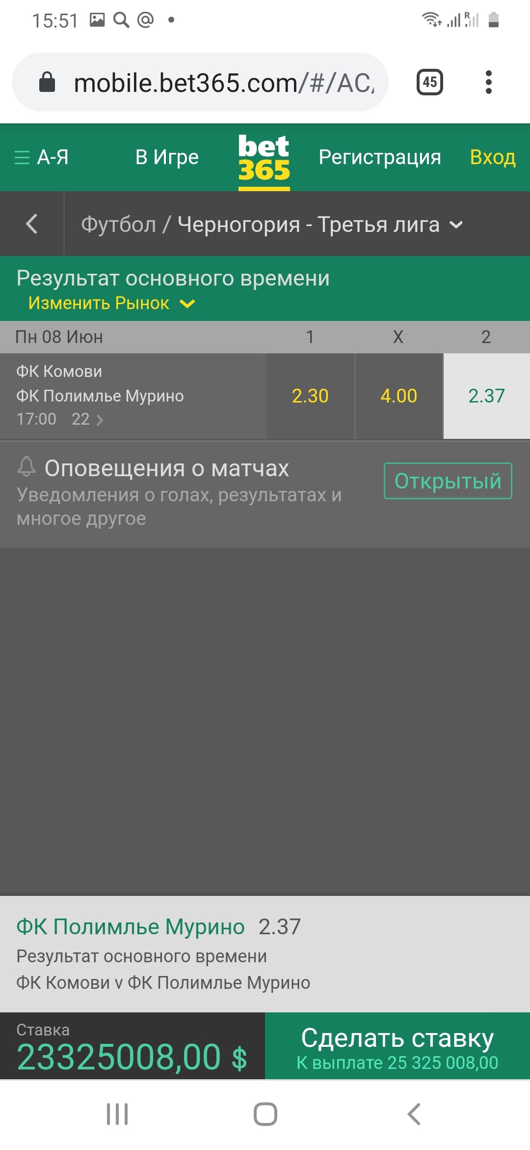 В любительской лиге Черногории состоится интересный матч. Казалось бы две неизвестные команды, а ещё вчера на победу «Полимле» был коэффициент 15,00, а сегодня уже 6,00. Начал разбираться, информации практически не найти. Откуда такие падения коэффициентов? Но по статистике это две равные команды, а зная любительский футбол, который проходит на встречных курсах, тут можно побороться за фору (+1,5).