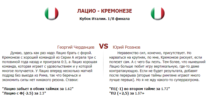 Думаю, здесь однозначно надо брать Кремонезе с форой. Гости играли три с половиной года назад с грандом Серии А – Аталантой, и проиграли всего лишь со счетом 0:3. Лацио - посредственная команда, играющая без удовольствия, у которой из достижений только вымученные победы над Ювентусом и Наполи, у которых явно половина футболистов играла с температурой. У Лацио впереди несколько матчей подряд без выезда из Рима, так что им нужно поберечься и сэкономить силы перед тяжелой поездкой в Парму.