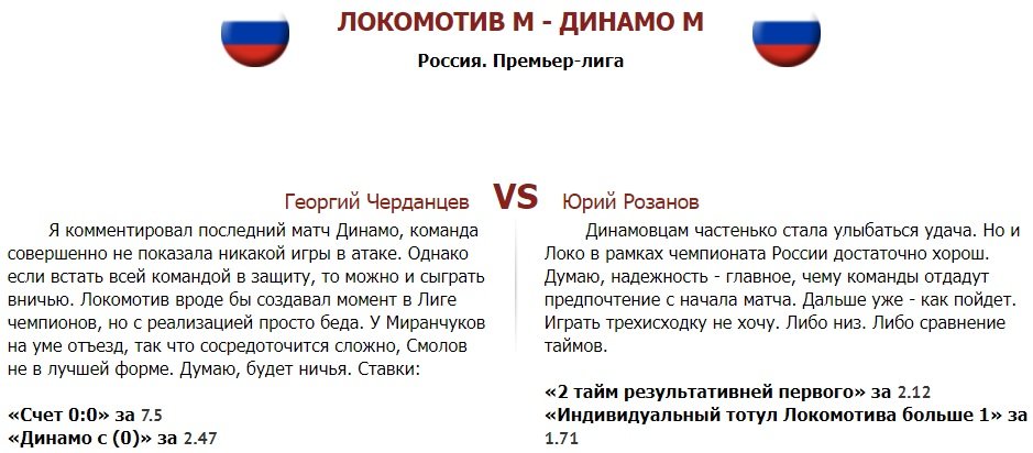 Матчи Динамо не то что комментировать, а даже одним глазом нельзя смотреть. С такими обороной и атакой я удивляюсь, что их не Кононов тренирует. Поэтому если они по-полицейски грамотно будут атаковать, то обязательно пропустят. Локомотив ничего путного не создаст у своих ворот, и беды не будет, в отличие от матча Лиги чемпионов. У Миранчуков все мысли о том, как бы их не продали в Ювентус, а то там ведь играть придётся, поэтому они супер сосредоточены на том, чтобы туда забрали кого-нибудь другого. Вот, например, «Герой России-2018» Смолов вообще сейчас в лучшей форме, как он быстро бежал в концовке матча с Байером, что аж пробежал дальше прострела. Не думая, вперед Локомотив!