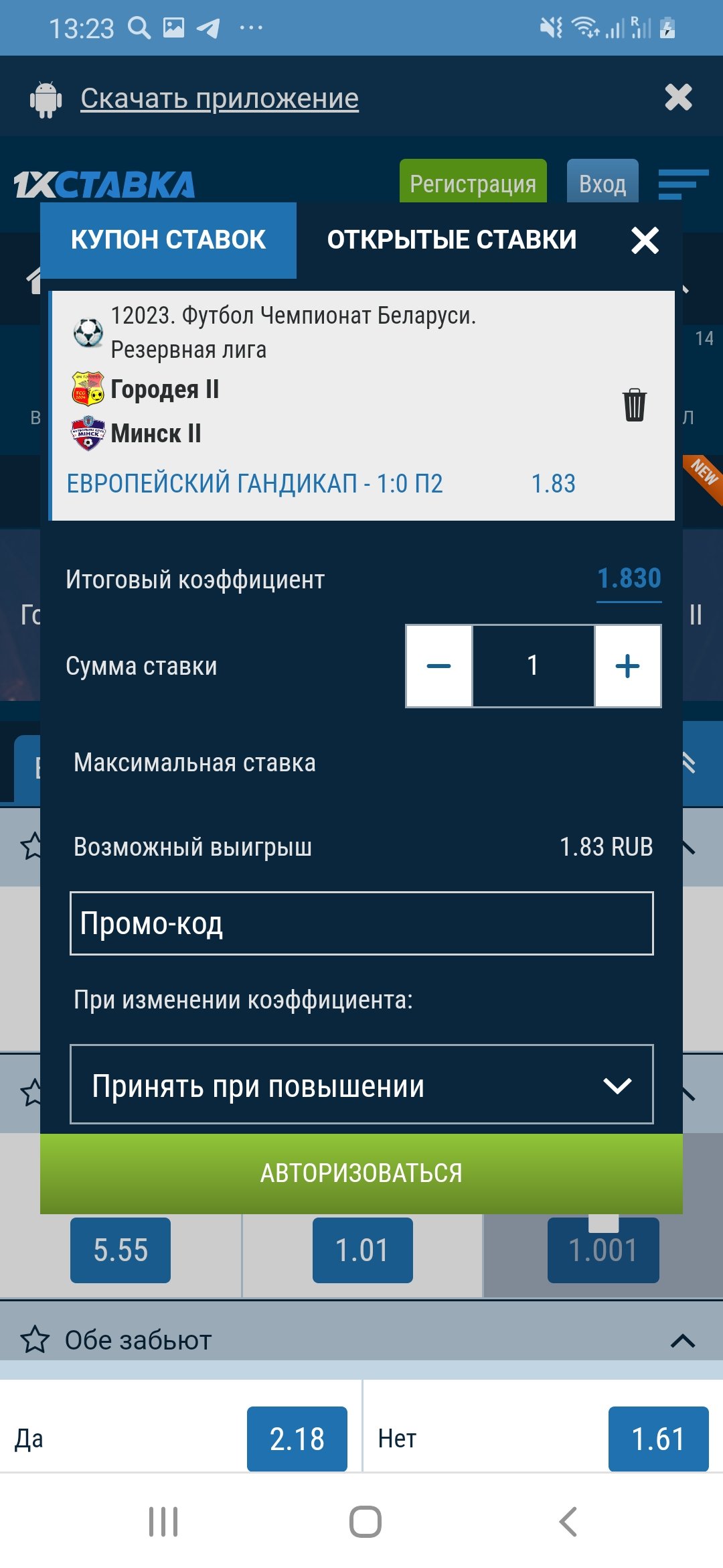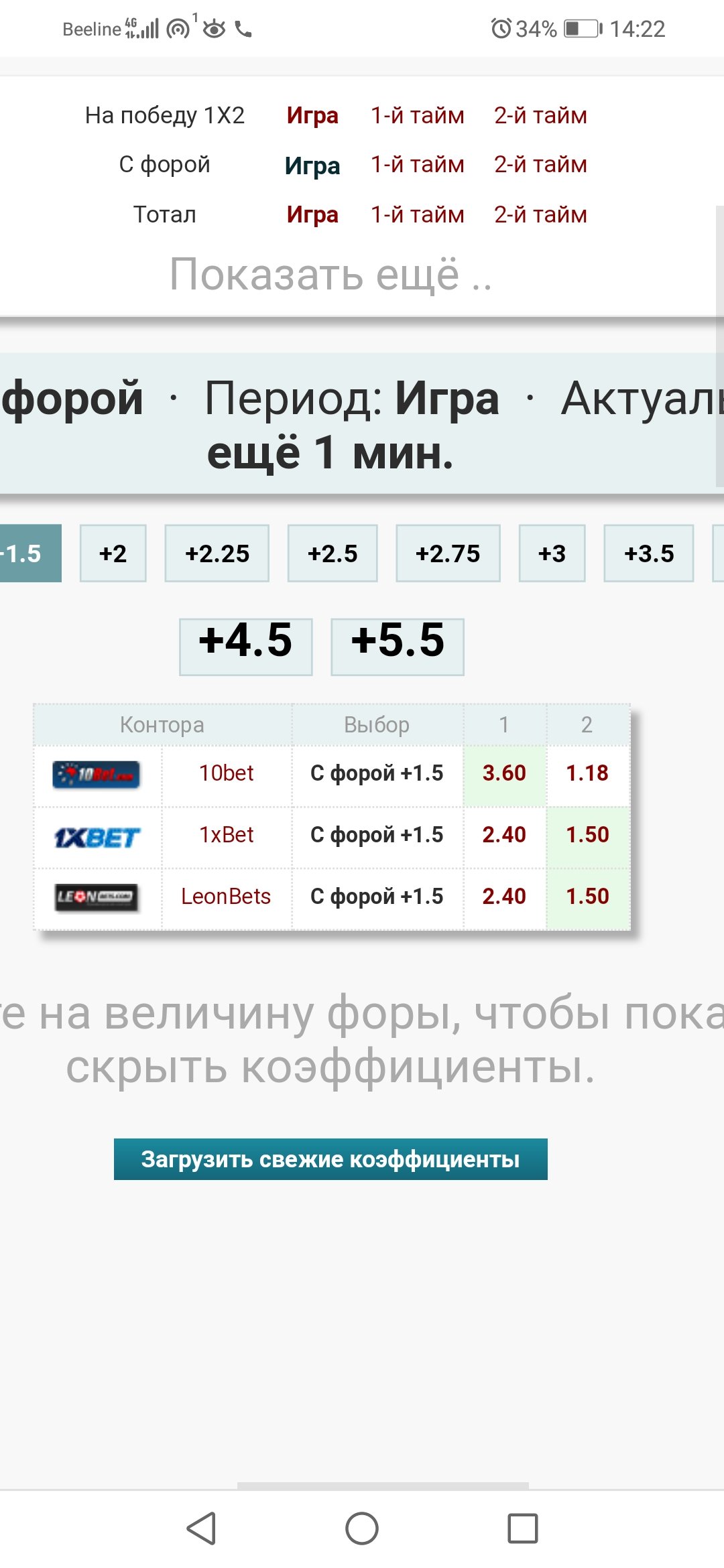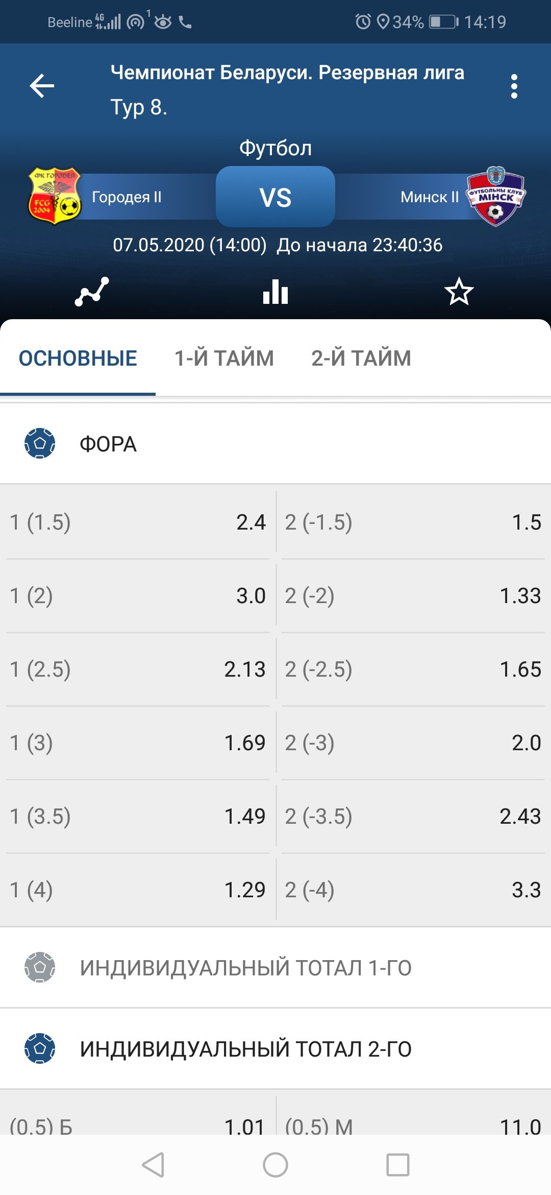 Сразу расскажу, для тех кто не разбирается в гандикапах, «Европейский гандикап – 1:0 Победа Минск-2» это тоже самое, что и «Победа Минск-2 с форой (-1,5)».