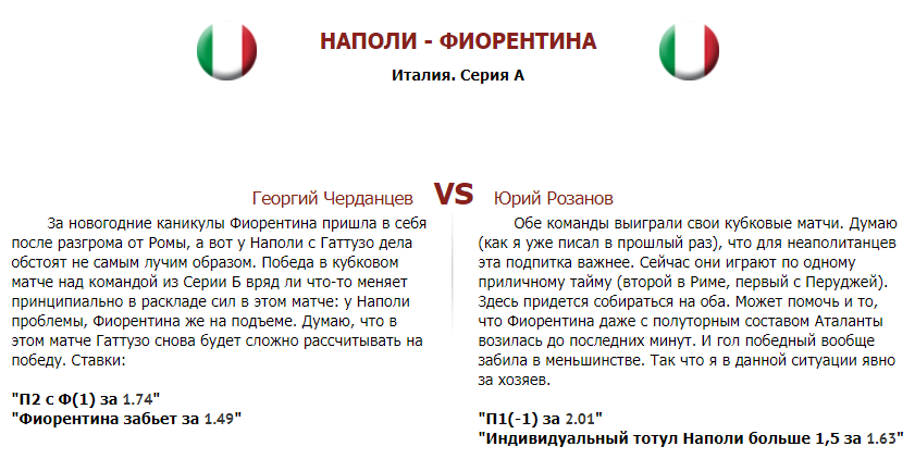 После Нового года Фиорентина ещё не пришла в себя, а вот Наполи просто летал по полю в матче Кубка Италии. Фиалкам пришлось играть кубковый матч на день позже, тратить силы и время на Аталанту, а Наполи спокойно, играючи, не напрягаясь, обыграл Перуджу. Эти факторы в корне меняют расклад сил в этом матче: у Фиорентины проблемы, Наполи же на подъеме. Уверен, в этом матче команда Гаттузо снова может рассчитывать на уверенную победу.