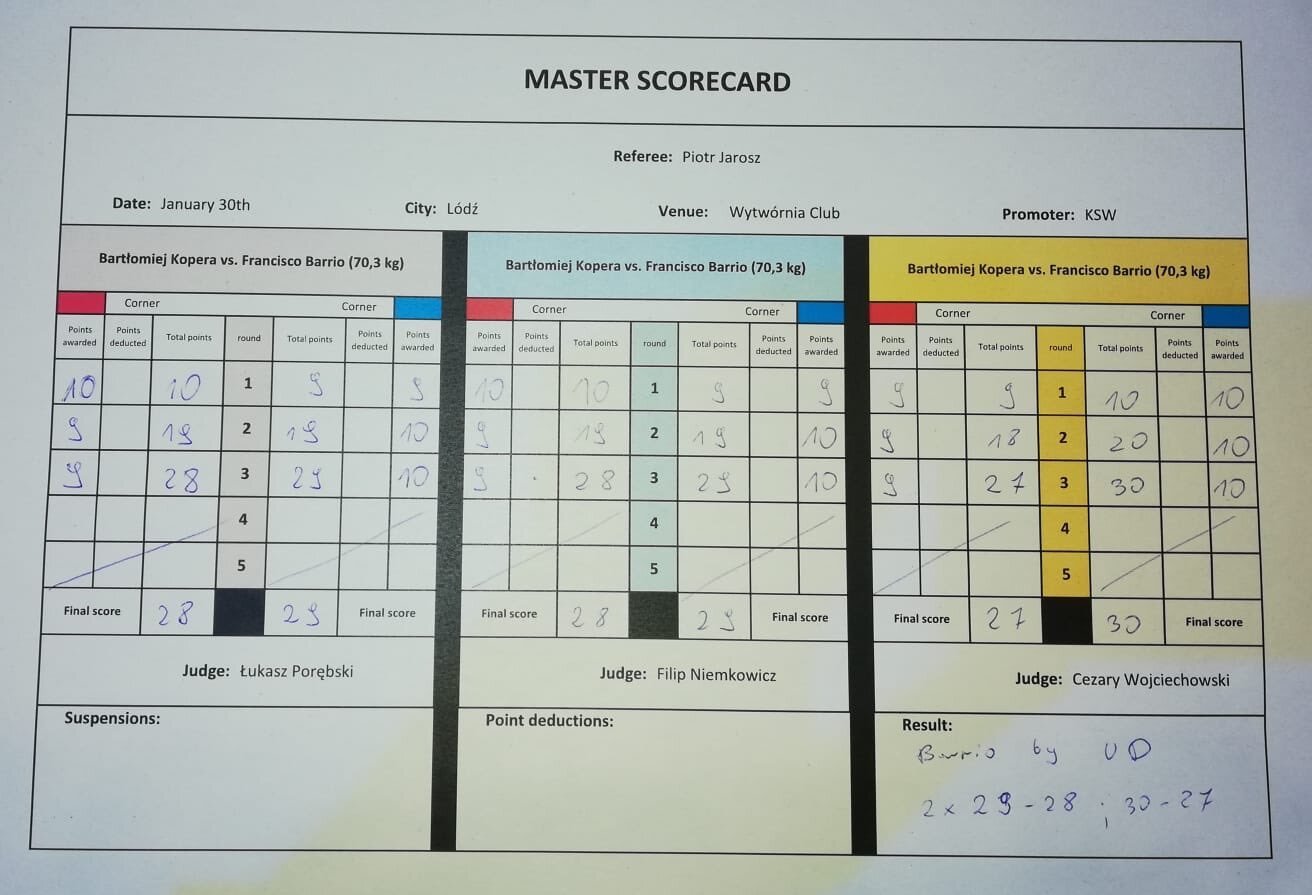Копера местный боец из города Лодзь, ему 28 лет, профессиональный рекорд 9-6. Копера – это дзюдоист с пурпурным поясом в джиу-джитсу, неплохой финишер, в плане партера, семь побед приёмами. Тренируется поляк в залах Zenith Vera Fight Club и WCA Fight Team. Бартоломей физически сильный спортсмен, но его самая большая слабость - кардио, если бой доходит до третьего раунда, он обычно сильно замедляется. В стойке Копера бьёт тяжело, но техника на низком уровне, слишком размашистые удары, неточные, при этом, стоит отметить лоу кики. Копера идёт на серии из трёх поражений, и вероятно, следующий бой решит его судьбу в организации KSW.