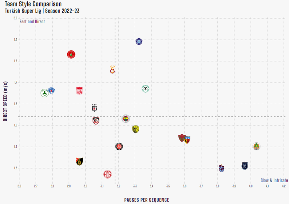 «Адана Демирспор» играет в искрометный, вертикальный футбол с использованием агрессивного нападения. По прямой скорости продвижения мяча к воротам соперника команде нет равных в лиге.