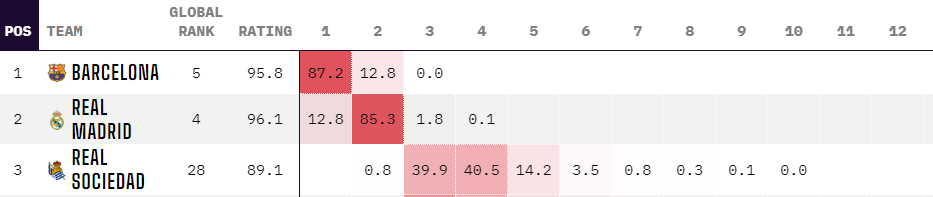 «Барселона» – единоличный лидер элитного дивизиона Испании. Команда выступает на столько уверенно, что уже практически гарантировала себе чемпионство. С вероятностью 87,2% «сине-гранатовые» финишируют на 1-м месте в этом сезоне.