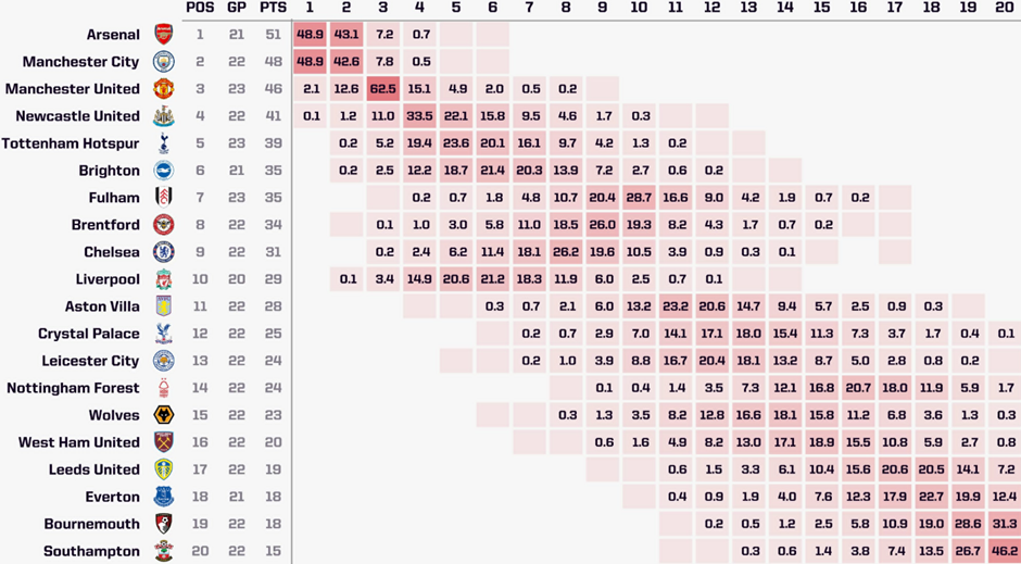 Но несмотря на сложную конъюнктуру за пределами поля, подопечные Пепа Гвардиолы продолжают усердно сокращать отставание от лидера. Если раньше вероятность того, что «канониры» доберутся первыми до трофея составляла около 55% (данные суперкомпьютера Opta), то сейчас наблюдается паритет (по 48,9%).