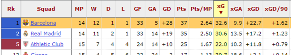 «Барселона» — абсолютный лидер Примеры. Является лучшей командой по ожидаемым забитым (xG = 32,9) и пропущенным (xGA = 9,9) голам, что говорит об идеальном балансе.