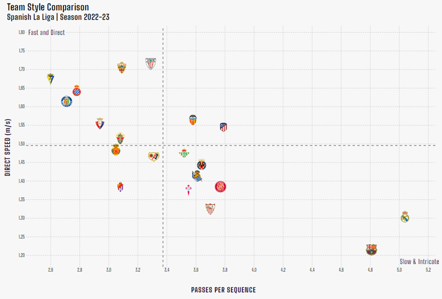«Эспаньол» — одна из самых контратакующих команд. По наименьшему времени владения мячом (7,30 с), количеству передач за одно владение (2,74) и прямой скорости атаки (1,69 м/с) входит в тройку лучших.