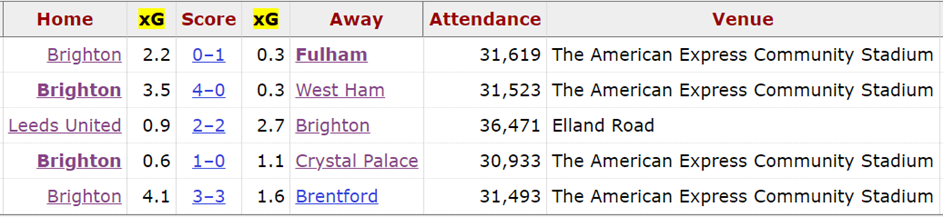 Стоит отметить, что некоторые неудачные матчи «Брайтона» в заключительных 5 турах связаны с низкой реализацией собственных моментов, о чем говорит соотношение ожидаемых забитых голов (xg).