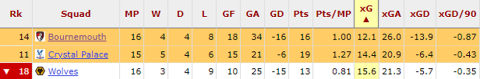 «Кристал Пэлас» занимает 11 строчку в таблице, имея в своем активе 19 очков после 15 туров. В действительности же «орлы» не далеко ушли от «Борнмута». По количеству ожидаемых забитых голов они расположились на предпоследнем месте (14,4 xG).