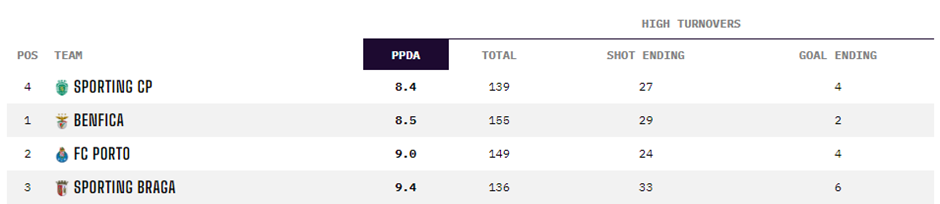 Среднее время владения мячом 65,9% – лучшее в лиге. По интенсивности прессинга (PPDA = 8,5) «Бенфика» уступает лишь «Спортингу».
