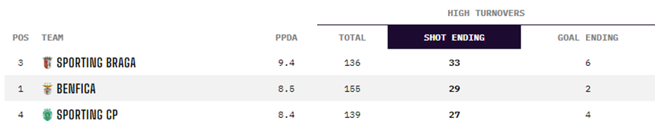 «Брага» нанесла наибольшее количество ударов (33) по воротам после отбора мяча в зоне не более 40 метров от ворот соперника и забила больше всего голов (6) в результате этого.