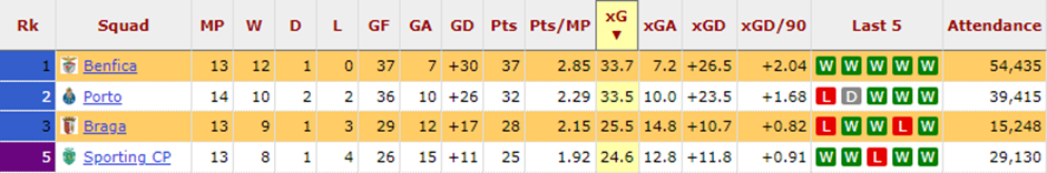 «Орлы» обладают идеальным балансом в чемпионате. По ожидаемым забитым голам (xG = 33,7) и ожидаемым пропущенным (xGA = 7,2) на данный момент это лучшая команда Португалии.