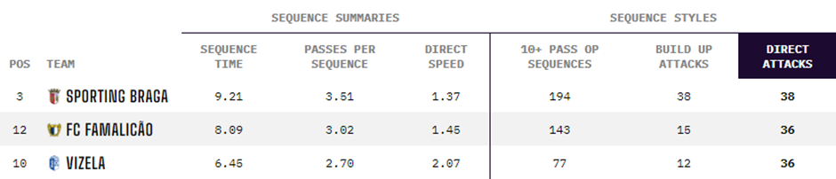 Отличительной особенностью команды является невероятно эффективный высокий прессинг (ppda = 10,1). С помощью него «Брага» смогла забить 8 голов после возврата мяча в радиусе 40 метров от ворот соперника.